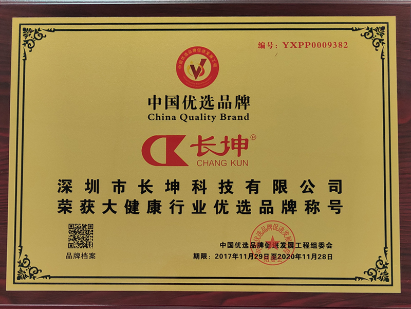 2017年12月,深圳市長坤科技有限公司成功被中國優(yōu)選品牌促進(jìn)發(fā)展工程選中,評選為“中國優(yōu)選品牌”,并授予其“大健康”行業(yè)優(yōu)選品牌稱號,以茲鼓勵(lì)。